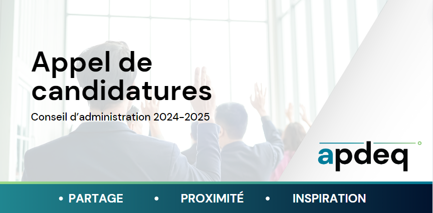 L’APDEQ invite aujourd’hui les personnes intéressées à soumettre leur candidature à titre de membre du conseil d’administration pour le prochain exercice, à compléter le bulletin de mise en candidature que vous trouverez en annexe de la présente ou en communiquant avec la permanence de l’APDEQ.